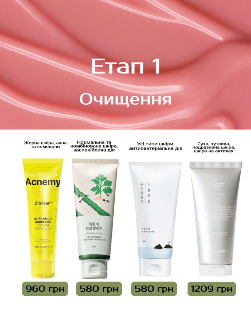 Перший і ключовий крок у догляді. Очищення видаляє забруднення, надлишок себуму, SPF та макіяж, не порушуючи захисний бар’єр шкіри.