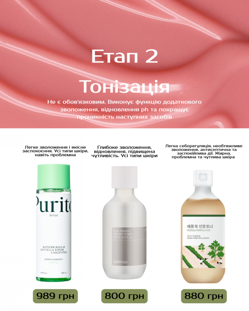 Тонізація не є обовʼязковим етапом, але вона значно підвищує ефективність догляду. Тонер відновлює pH після очищення, забезпечує додаткове зволоження та покращує проникнення активних компонентів.